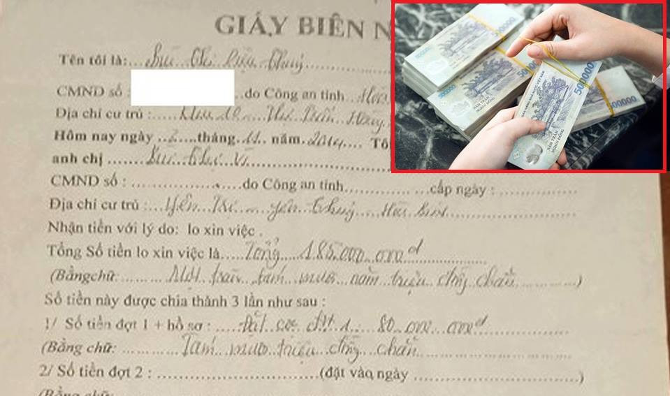 Đến ngày 3/11/2014, chị Thúy trực tiếp đến nhà tôi, chờ cháu tôi mang hồ sơ xuống và nhận tiền, khi nhận hồ sơ và tiền chị Thúy có viết cho tôi giấy biên nhận. Trong đó ghi rõ tổng số tiền lo xin việc là 185 triệu đồng và số tiền đặt cọc là 80 triệu đồng.
