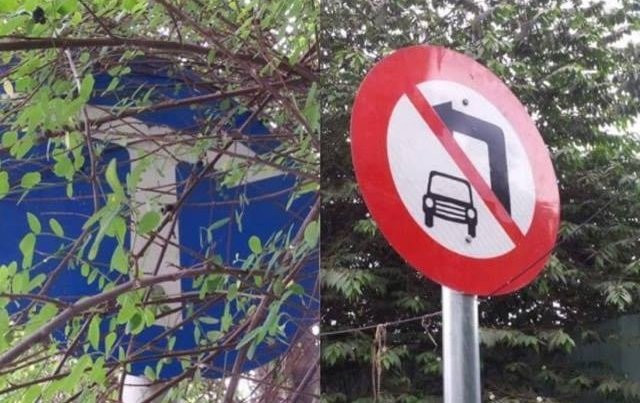Hai biển báo trên đường Xa Lộ Hà Nội bị cây phủ mát. (Ảnh: Quang Hải)