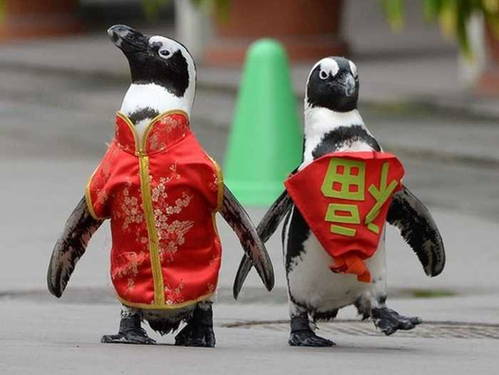 2 chú chim cánh cụt mặc quần áo có họa tiết màu đỏ và chữ Phúc dán ngược đi lại ở đường phố Yokohama, Nhật Bản