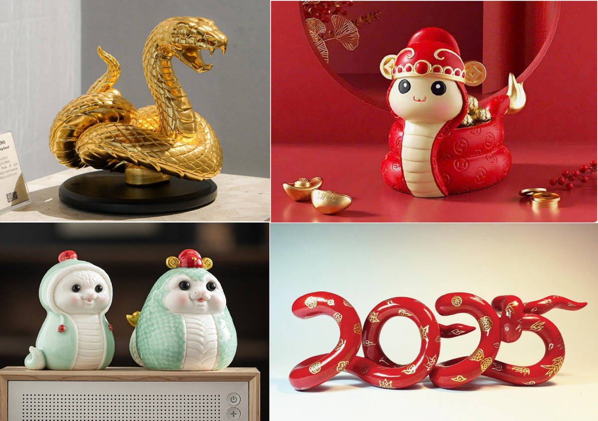 Tượng rắn uốn lượn tạo thành hình năm 2025 được làm từ chất liệu sơn mài cốt resin với 4 màu đỏ son, xanh lục bảo, xanh lá tùy biến, xanh dương tùy biến. Những sản phẩm này được sơn thủ công bằng tay nên nét vẽ hoa văn không giống nhau mang ý nghĩa trưng bày vô cùng ý nghĩa trong năm Ất Tỵ.