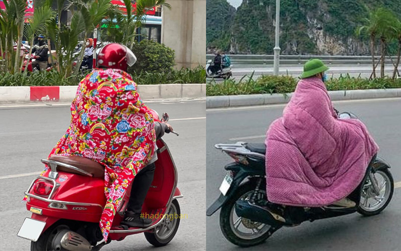 Dù cảnh đi xe máy trùm chăn rất hài hước, đây không phải là cách giữ ấm an toàn. Chiếc chăn cồng kềnh hạn chế cử động, khiến tài xế không thể phản ứng linh hoạt, có thể gặp nguy hiểm khi tham gia giao thông. (Ảnh: Phương Linh)