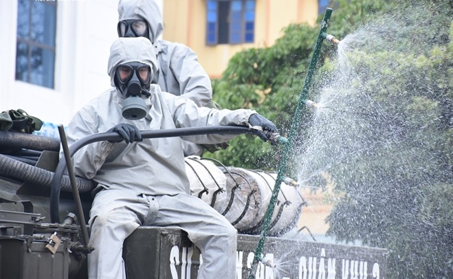 Xe đặc chủng của Bộ Tư lệnh Quân khu 3 phun khử khuẩn ở ổ dịch COVID-19 Chí Linh (Hải Dương).