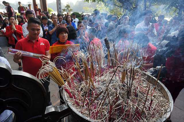Đình Trấn Ba nằm trong quần thể đền Ngọc Sơn những ngày này cũng chật cứng người đến làm lễ.