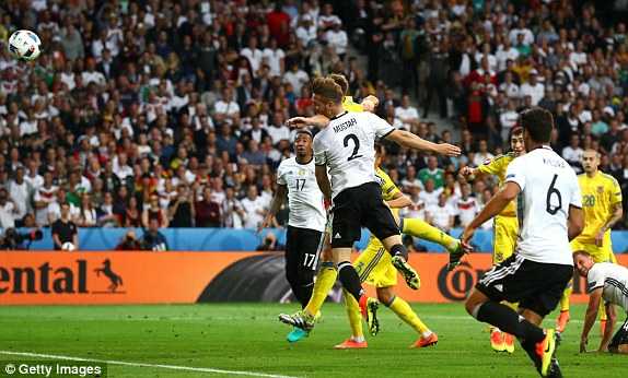 13/06/2016 02:43:00 +07:00Toni Kross đá phạt đúng tầm di chuyển đánh đầu của Mustafi. Bàn mở tỷ số của tuyển Đức đến ở phút 18.