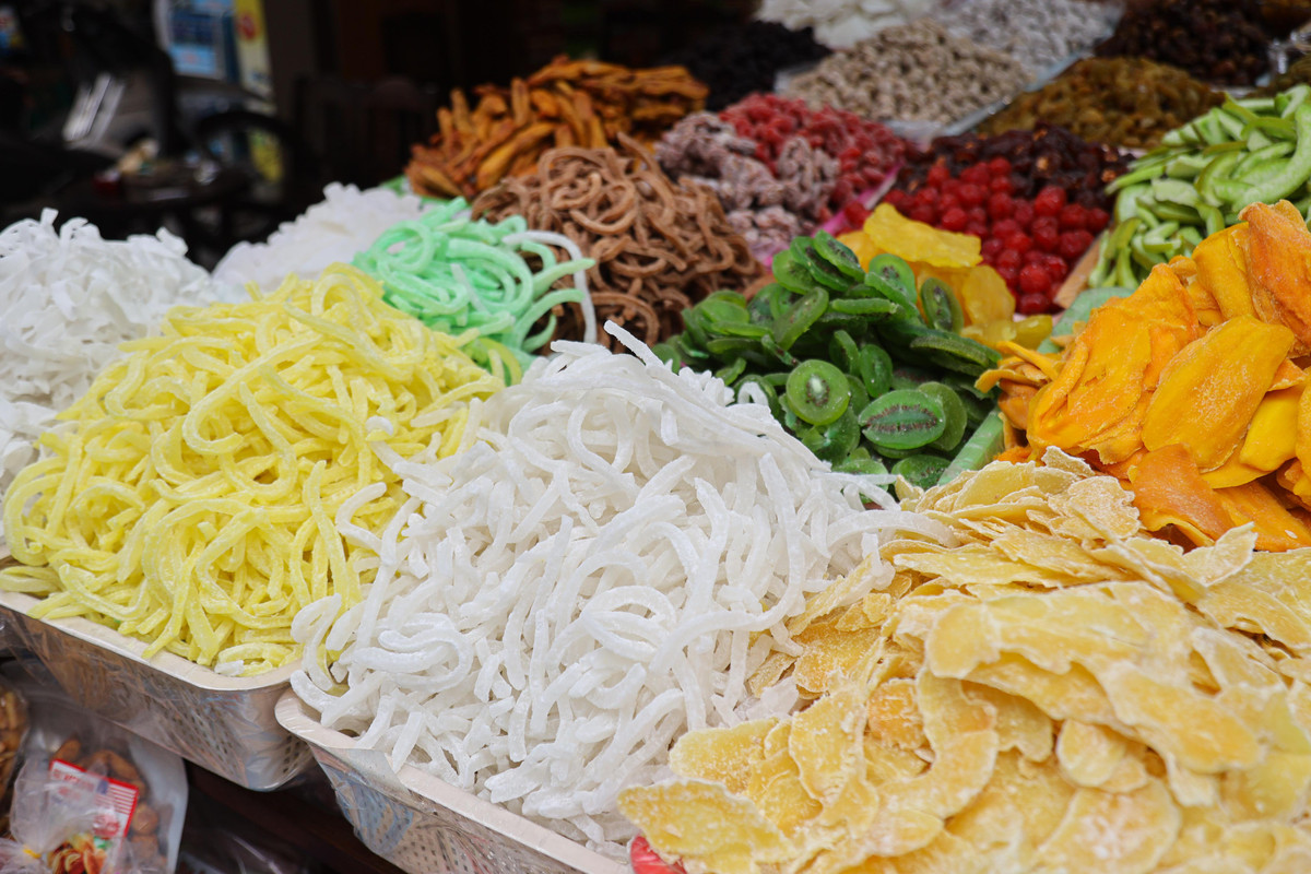 Những hộp mứt thập cẩm không thể thiếu trên kệ hàng Tết.