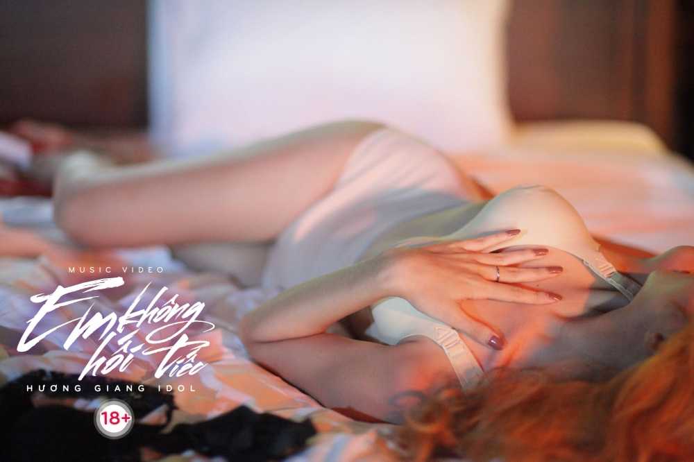 Trước đó, Hương Giang đã chia sẻ những hình ảnh khá nhạy cảm trong MV Em không hối tiếc được cô và ê-kíp chủ động dán mác 18+. Hương Giang tự nhận bản thân mạo hiểm khi thử sức với MV 18+ và nói đùa: “Số lượng khán giả sẽ hạn chế và tôi phải xin lỗi các bạn nào chưa đủ 18 tuổi sẽ không được xem MV. Vì trong đây 90% là những cảnh nóng”.