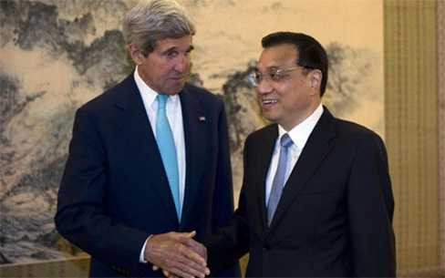 | Ngoại trưởng Mỹ John Kerry bắt tay Thủ tướng Trung Quốc Lý Khắc Cường trong cuộc gặp ngày 10/7 (Ảnh AFP) |