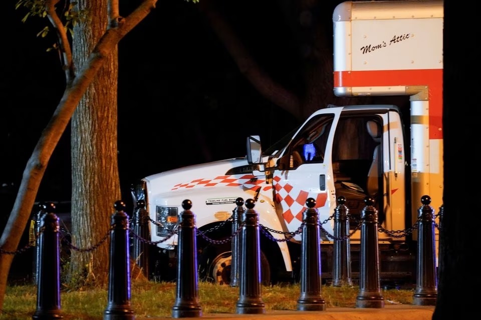 Chiếc xe tải đâm vào hàng rào bảo vệ an ninh ở khu vực gần Nhà Trắng. (Ảnh: Reuters)