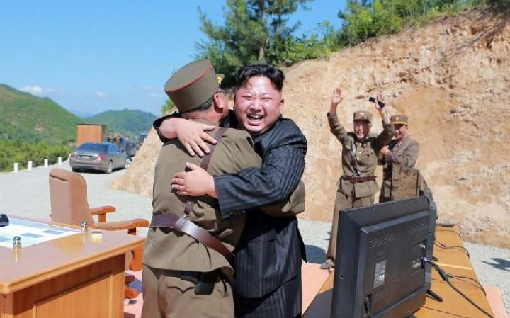 Ông Kim Jong-un "ăn mừng" lần thử nghiệm tên lửa đầu tiên. (Ảnh: Telegraph)