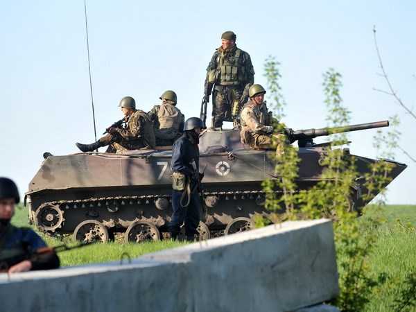 | Binh sỹ và cảnh sát Ukraine gác tại một trạm kiểm soát gần thành phố Slavyansk ngày 25/4 |