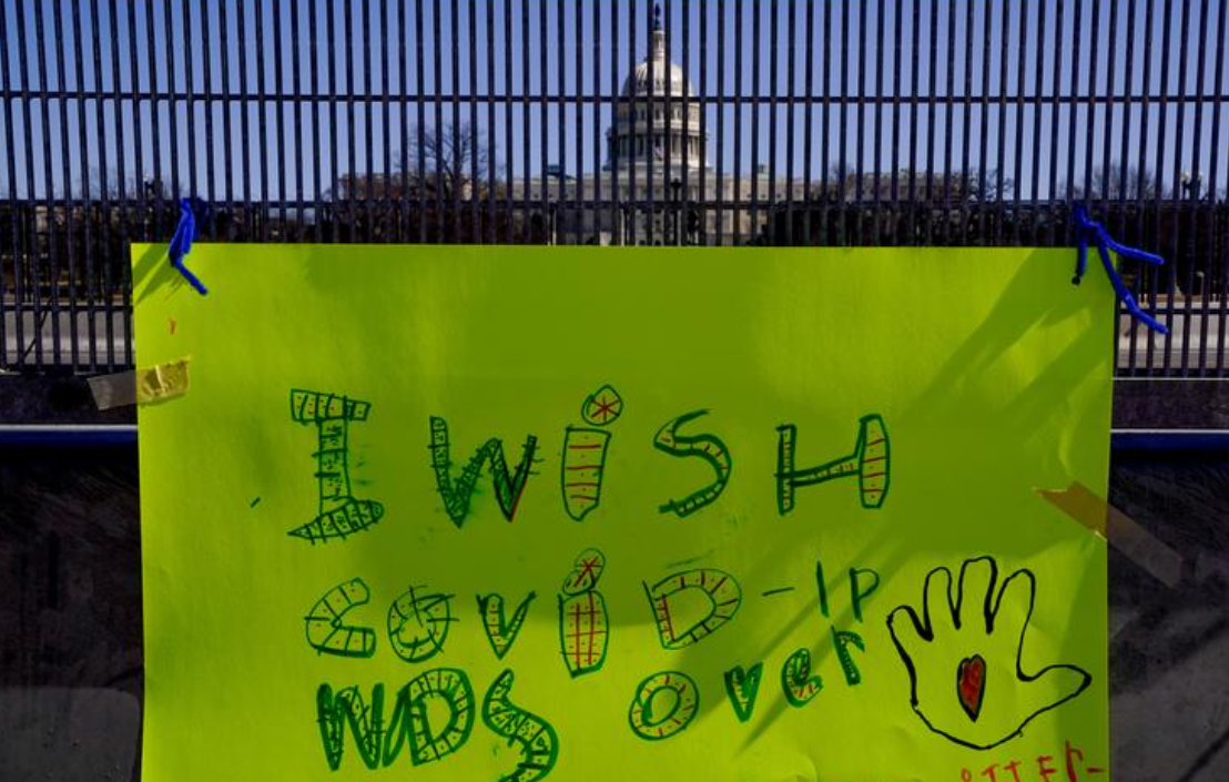 Tấm bảng với dòng chữ "tôi ước COVID-19 kết thúc" bên ngoài tòa nhà Quốc hội Mỹ. (Ảnh: Reuters)
