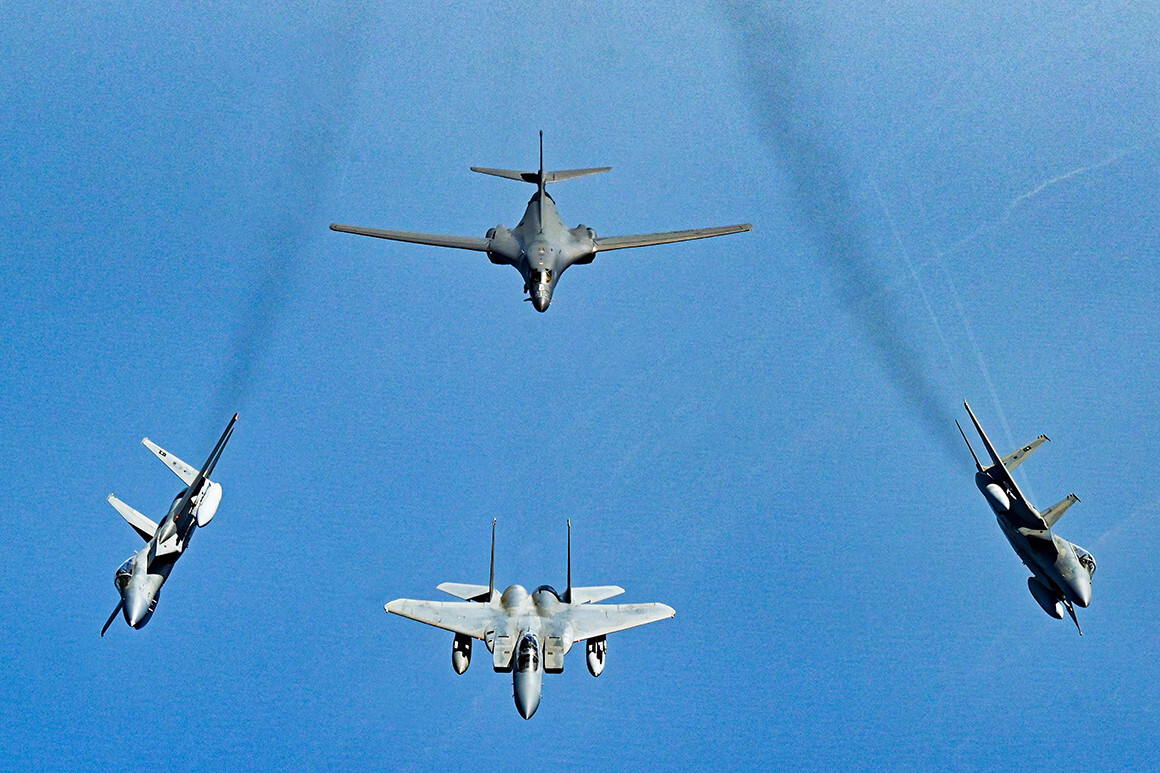 0anh tạc cơ B-1B Lancer của Mỹ được hộ tống bởi các tiêm kích đồng minh thị uy gần Irran. (Ảnh: AP)