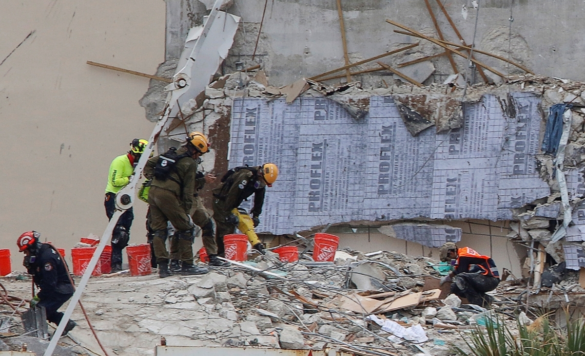 Các hoạt động tìm kiếm và cứu hộ tại hiện trường vụ sập tòa nhà chung cư ở bang Florida, Mỹ đã phải tạm ngừng do các lo ngại về an toàn. (Ảnh: Reuters)