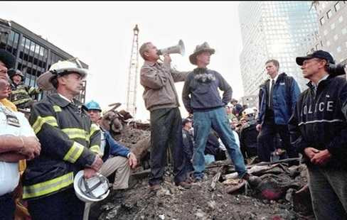 | Tổng thống George W. Bush nói chuyện với các nhân viên cứu hộ tại hiện trường vụ khủng bố ngày 14/9/2001 |