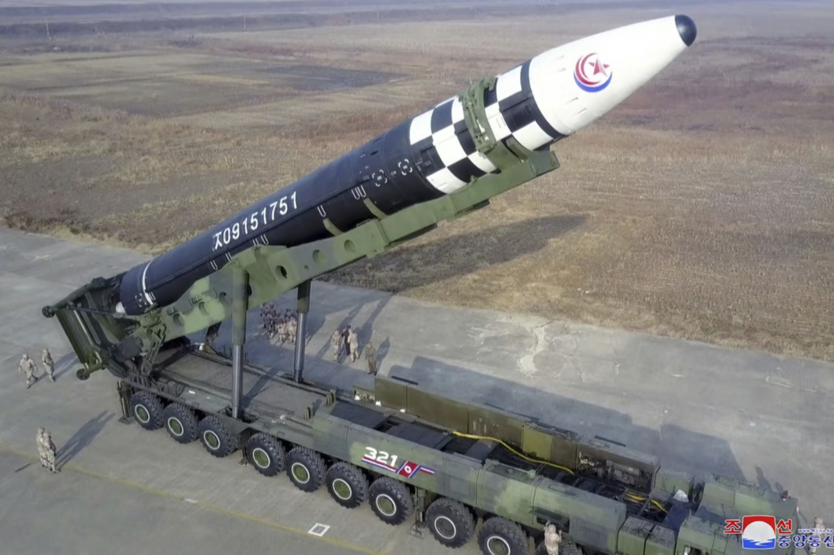 Tên lửa đạn đạo xuyên lục địa Hwasong-17 của Triều Tiên trước khi phóng thử tại sân bay quốc tế Bình Nhưỡng. (Ảnh: KCNA/AP)