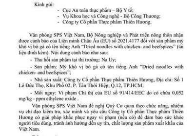 Liên quan tới vụ việc này, Văn phòng SPS Việt Nam (Bộ Nông nghiệp và Phát triển nông thôn) vừa có văn bản gửi Cục An toàn thực phẩm (Bộ Y tế), Vụ Khoa học Công nghệ (Bộ Công Thương) và Công ty CP Thực phẩm Thiên Hương (TP.HCM) về cảnh báo của Liên minh Châu Âu (EU) đối với sản phẩm mì khô vị bò gà.