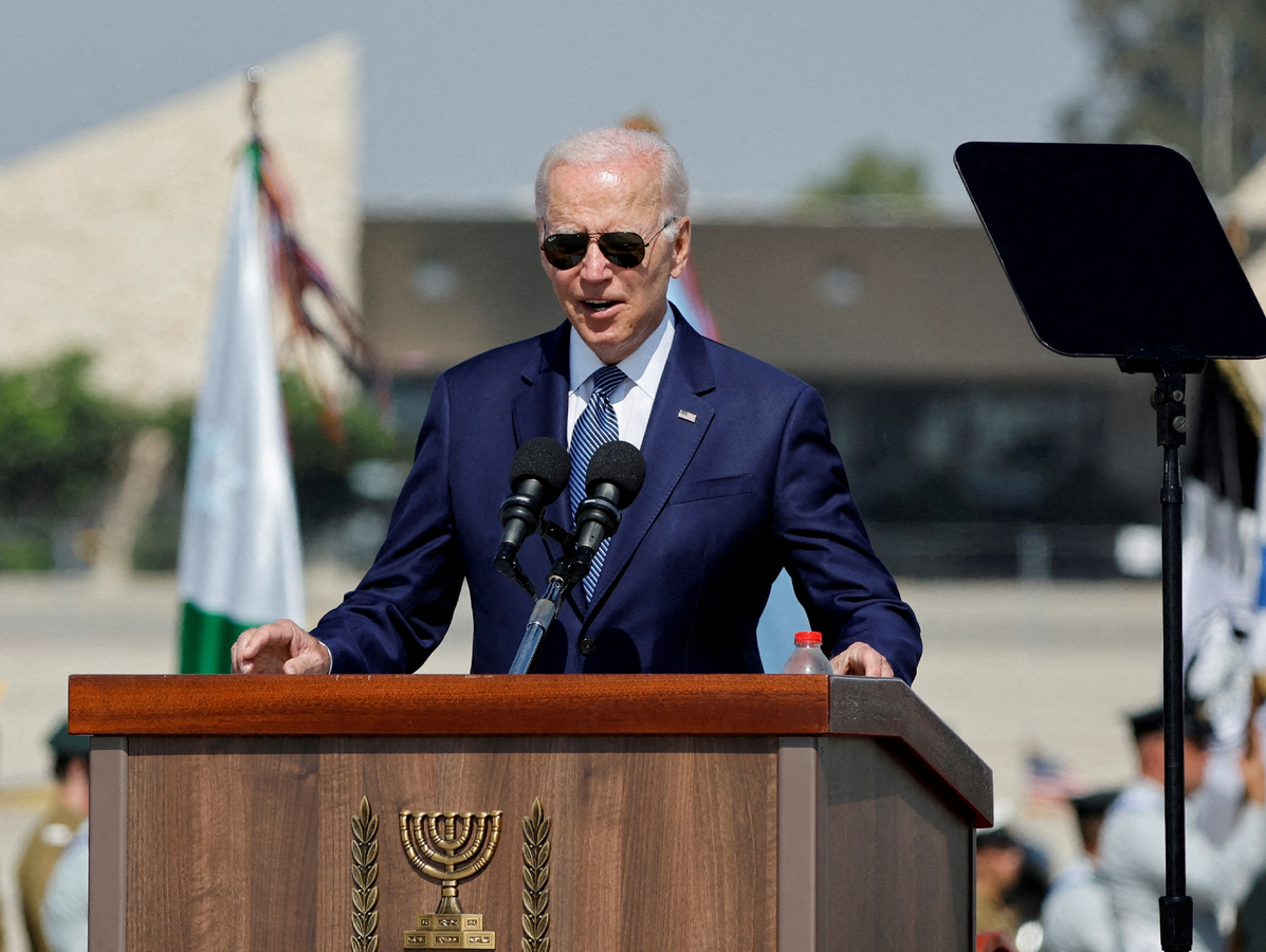 Tổng thống Mỹ Joe Biden phát biểu trong lễ đón tại Sân bay Quốc tế Ben Gurion ở Lod, gần Tel Aviv, Israel, ngày 13/7. (Ảnh:REUTERS)