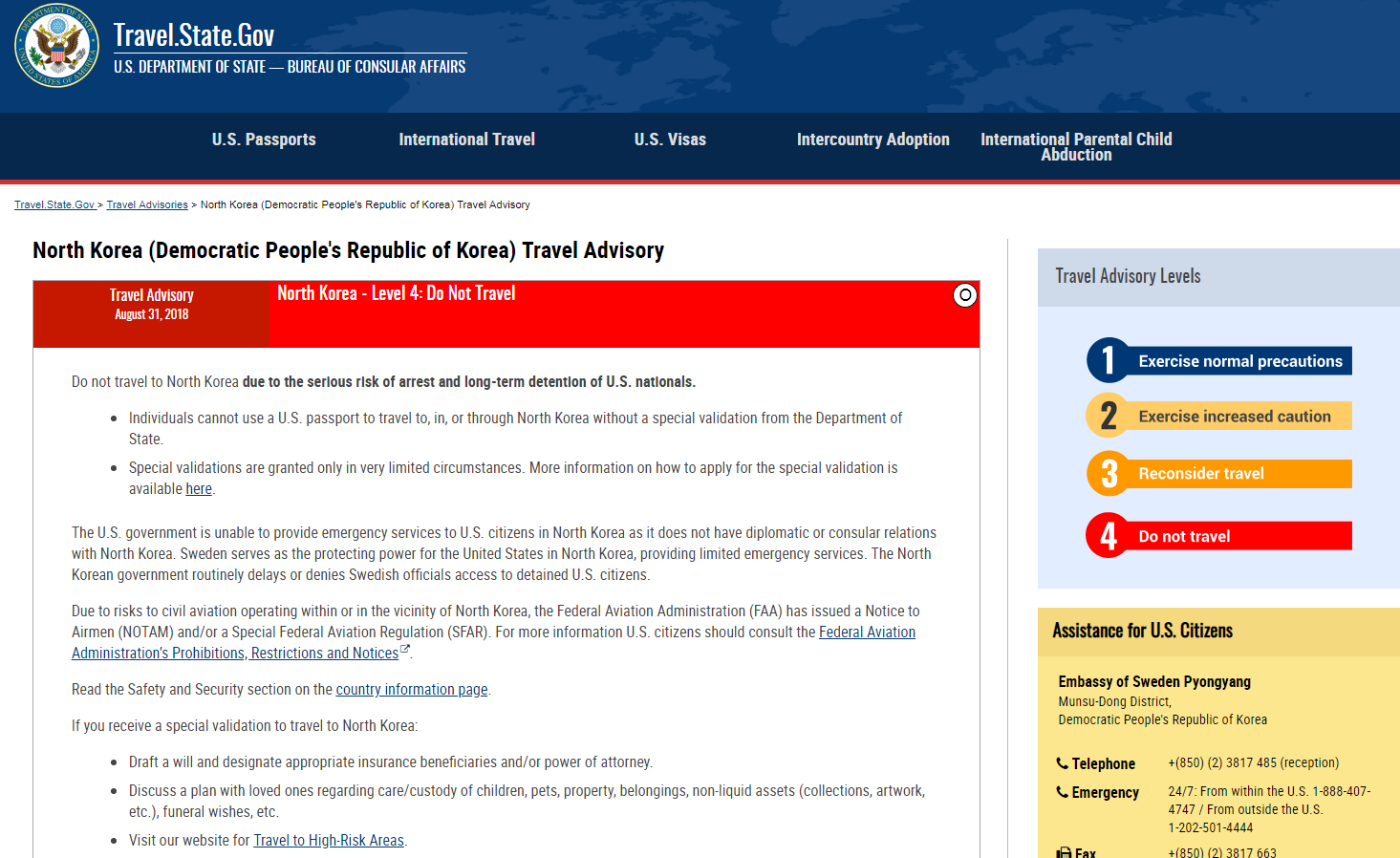 Bộ Ngoại giao Mỹ khuyến cáo công dân không đến Triều Tiên. (Ảnh chụp màn hình)