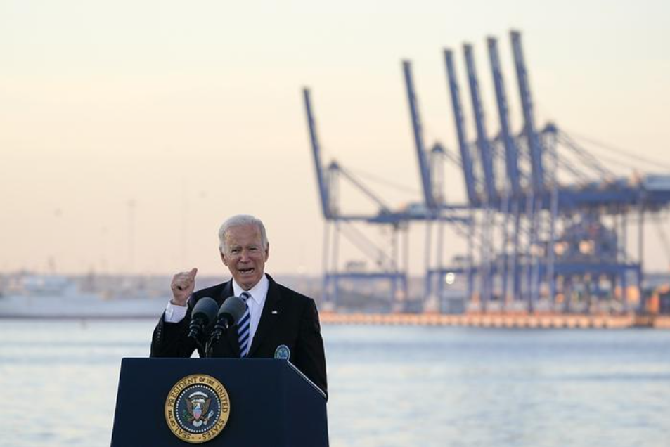 Tổng thống Mỹ Joe Biden phát biểu trong một chuyến thăm cảng Baltimore ở Maryland, phía sau là cần cẩu Neo-Panamax do công ty Zhenhua Heavy Industries của Trung Quốc sản xuất. (Ảnh: Visual China)