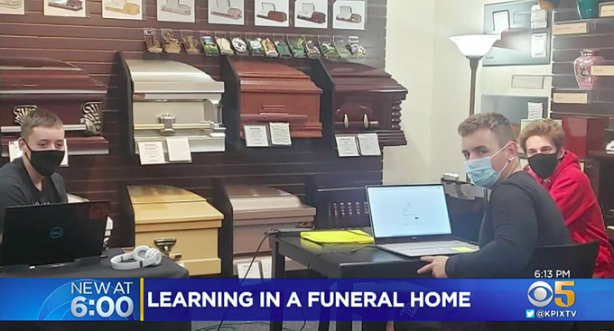 "Hãy đóng gói sách vở của các con và mang ra xe", chị nói với hai con và dẫn chúng đến phòng để quan tài của nhà tang lễ. Những đứa trẻ bịt tai lại, ngồi cách nhau mỗi người một hướng để hoàn toàn tập trung vào màn hình. Nơi đau buồn nhưng yên tĩnh này đã trở thành không gian học tập hiệu quả.