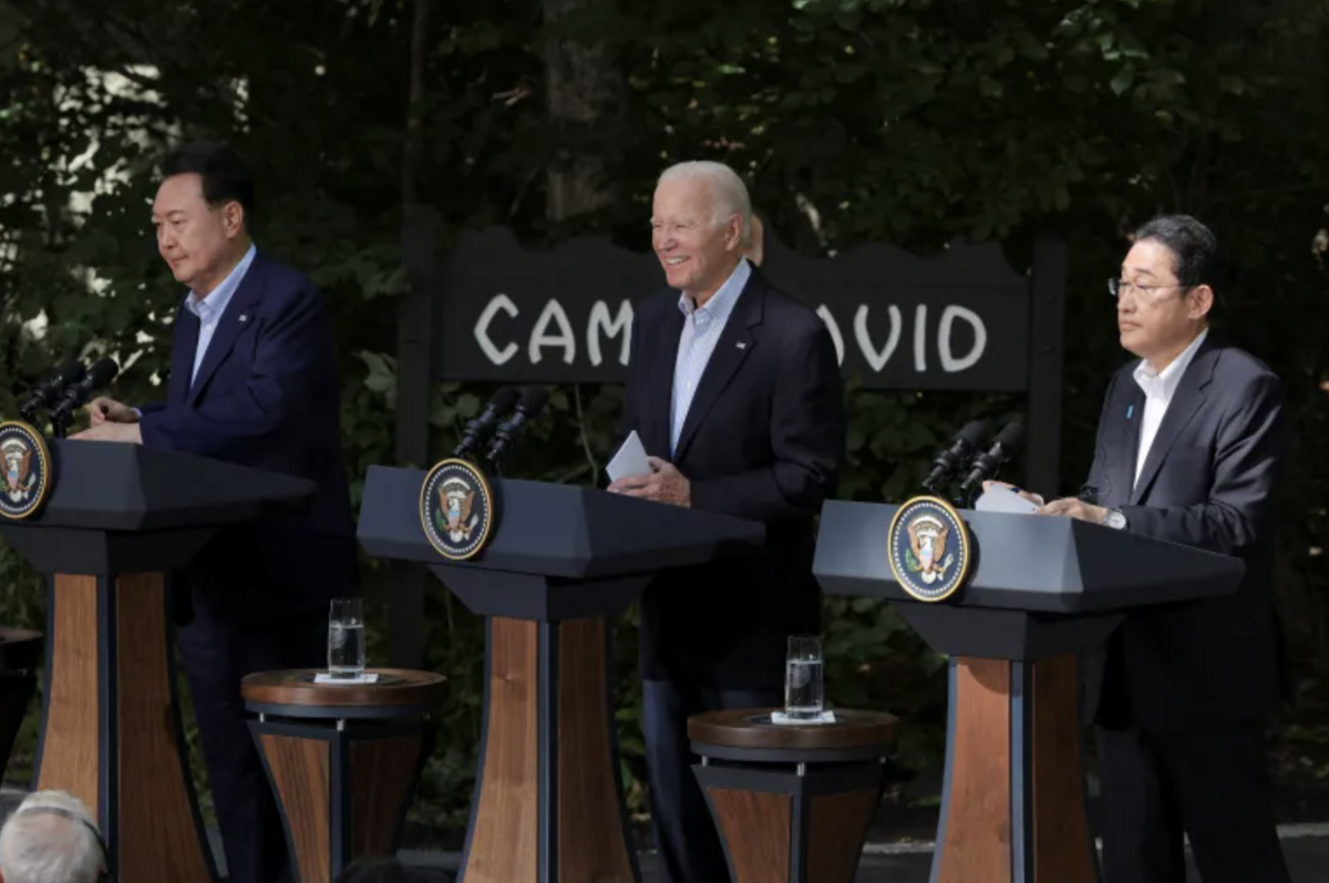 Sự kiện tại Trại David đánh dấu cuộc gặp chính thức đầu tiên giữa Tổng thống Mỹ Joe Biden, người đồng cấp Hàn Quốc Yoon Suk-yeol và Thủ tướng Nhật Bản Fumio Kishida.