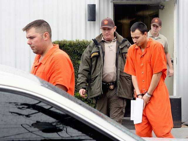 | Trung sĩ Anthony Peden (trái) và binh nhì Isaac Aguigui bị còng tay dẫn đi ngày 12/12/2011 sau khi đối mặt với thẩm phán ở văn phòng cảnh sát quân Ludowici, Georgia |