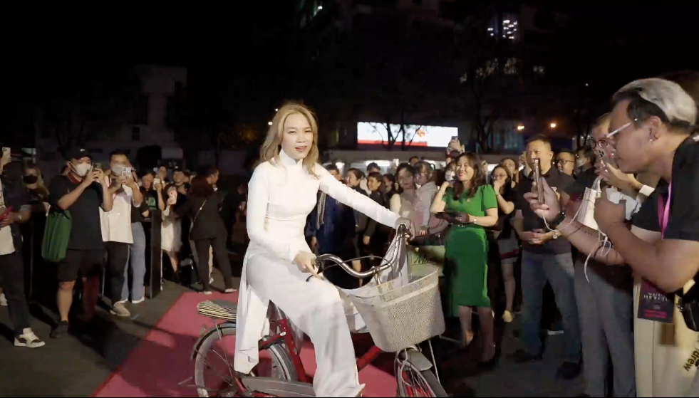 Tối 6/4, Mỹ Tâm khiến người hâm mộ bất ngờ với màn xuất hiện tại sự kiện ra mắt phim tài liệu liveshow của cô tại TP.HCM. Nữ ca sĩ lựa chọn tà áo dài trắng nền nã, đạp xe tiến vào thảm đỏ. "Hoạ mi tóc nâu" nở nụ cười rạng rỡ, vẫy chào người hâm mộ.