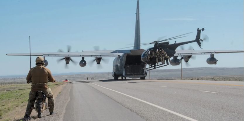 Các phi công chiến thuật đặc biệt của Lực lượng Vệ binh Quốc gia Mỹ trên trực thăng MH-6M, dỡ hàng từ MC-130J trong cuộc tập trận trên đường cao tốc Wyoming vào tháng 5. (Ảnh: Business Insider)