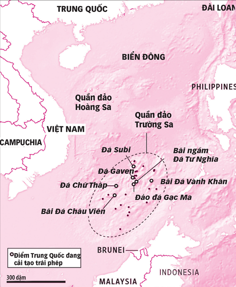 | Bản đồ các bãi đá, bãi cạn mà Trung Quốc đang xây dựng, cải tạo trái phép ở quần đảo Trường Sa của Việt Nam |