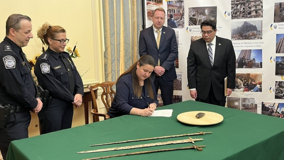 Theo RT, chính quyền Mỹ đã bàn giao một số vũ khí cổ, bao gồm 3 thanh kiếm và 1 rìu đá, cho đại sứ quán Ukraine ở Washington DC. Phái đoàn Ukraine cảm ơn chính quyền Mỹ đã giúp "hồi hương tài sản văn hóa và một phần lịch sử".