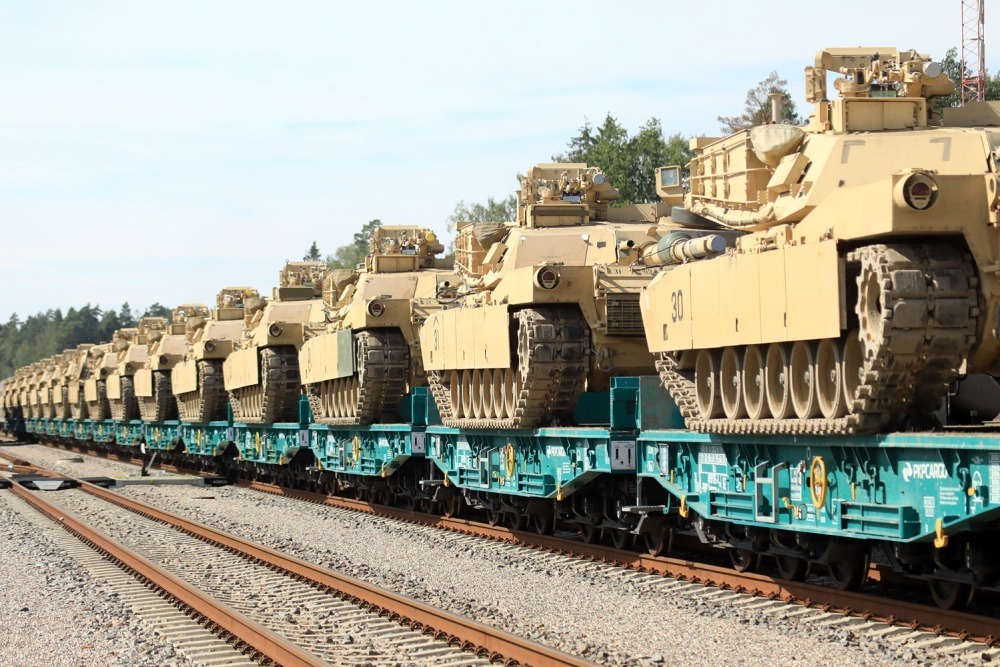 Hình ảnh xe tăng M1 Abrams của quân đội Mỹ tại nhà ga xe lửa Mockava ở Litva vào ngày 5/9/2020