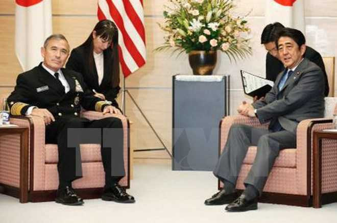 Thủ tướng Nhật Bản Shinzo Abe (phải, trước) trong cuộc gặp Đô đốc Mỹ Harry Harris (trái, trước) tại Tokyo ngày 16/2