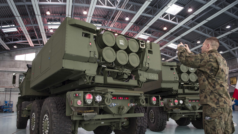 Các bệ phóng tên lửa Himars do Mỹ sản xuất tập kết tại căn cứ quân sự ở Warsaw, Ba Lan. (Ảnh: Getty Images)