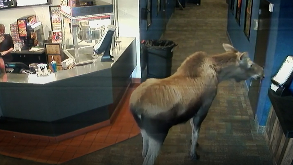 Con nai rừng xuất hiện từ khu rừng và bước vào rạp chiếu phim Kenai ở Kenai, Alaska, Mỹ và ăn bỏng ngô trước sự ngỡ ngàng của nhân viên.