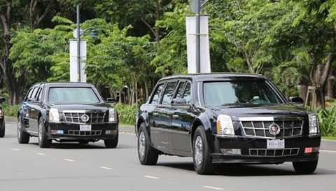 | Cặp đôi xe Cadillac One luôn song hành cùng nhau trong những ngày đi lại của Tổng thống Obama tại Việt Nam. Ảnh: VNE |