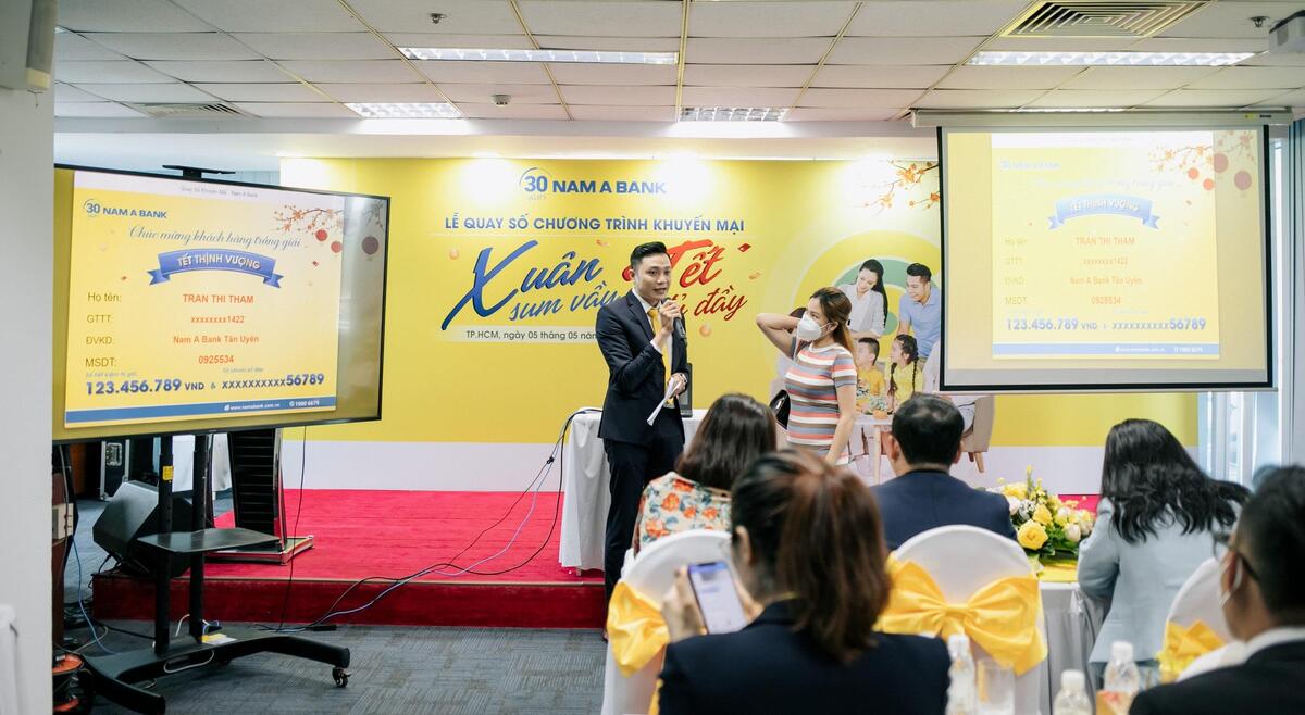 Trong tổng hơn 3 triệu mã dự thưởng của KH tham gia chương trình, Ban tổ chức tìm ra 6 chủ nhân của 6 giải Tết Thịnh Vượng (Sổ tiết kiệm 123.456.789 đồng/giải, TKTT số đẹp Thịnh vượng, với 5 số cuối 56789) lần lượt là KH Trần Thị Thắm (Nam A Bank Tân Uyên); KH Thân Lệ Hoa (Nam A Bank Đông Đô); KH Lê Thị Ánh Tuyết (Nam A Bank Bến Tre); KH Nguyễn Thị Quế Hương (Nam A Bank Đà Nẵng); KH Trần Thị Bảo Trâm (Nam A Bank Trung tâm kinh doanh) và KH Lê Thị Năm (Nam A Bank Rạch Ông).