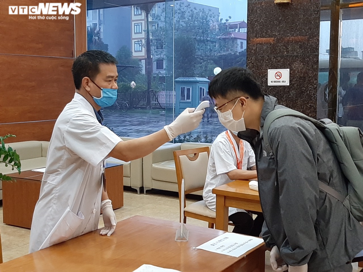 Chuyên gia Hàn Quốc của Công ty TNHH Samsung Display Việt Nam kiểm tra thân nhiệt trước khi đi làm tại cơ sở lưu trú.