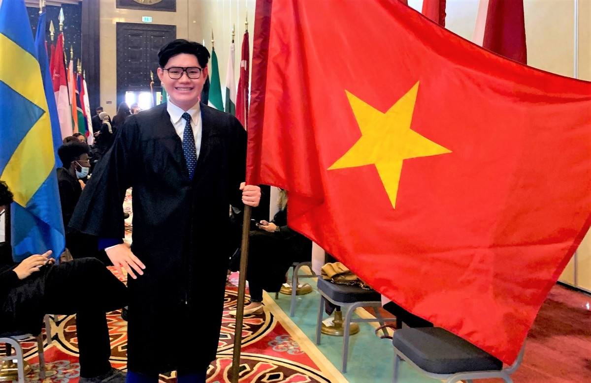 Nam sinh Nguyễn Lê Đông Hải tự hào mang lá cờ Tổ quốc trong một buổi trao giải thưởng ở trường đại học Mỹ.