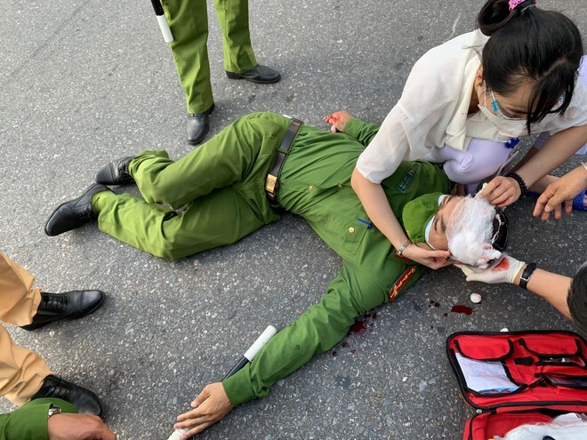 Cú tông khiến Đại úy Lê Ngọc Dũng ngã ra đường, chảy máu vùng đầu, được đưa đi cấp cứu tại Bệnh viện 19/8, Bộ Công an.