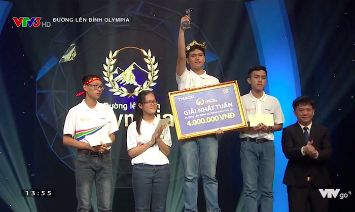 Chương trình đường lên đỉnh Olympia cuộc thi tuần 2, tháng 1, quý I là sự tranh tài của 4 thí sinh: Hoàng Anh Quân (THPT Nguyễn Huệ, Thừa Thiên Huế; Đinh Việt Nam (THPT Quỳnh Côi, Thái Bình); Phạm Thu Hằng (THPT Thanh Hà, Hải Dương); Trần Thiên Phúc (THPT chuyên Trần Đại Nghĩa, TP. HCM).