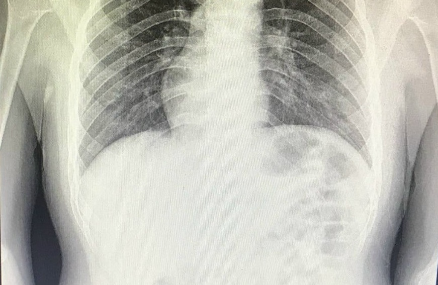 Hình ảnh phim chụp x-quang của bệnh nhân với phủ tạng nằm bên phải.