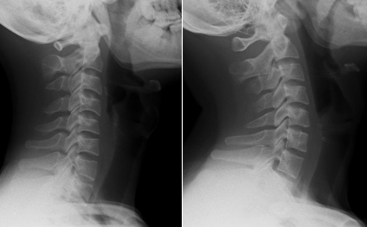 Cột sống cổ của nam thanh niên thẳng đứng (ảnh 1) và cột sống cổ bình thường (ảnh 2). (Ảnh: BSCC)