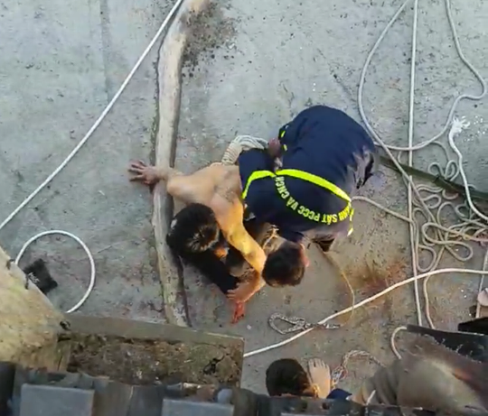 Sau khi trấn tĩnh tinh thần V., khoảng 6h30, lực lượng chức năng đã dùng dây và đưa V. lên khu vực an toàn.