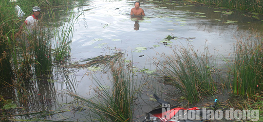 Nhiều người xuống vuông tôm mò tìm thi thể chủ nhân chiếc xe máy nhưng bất thành.