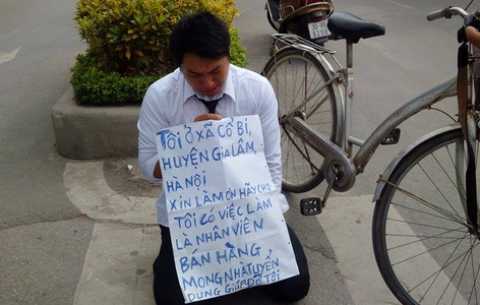 Chiều 5/1, trên mạng xã hội facebook xuất hiện bức ảnh một nam thanh niên đang quỳ gối trước Cổng Đài truyền hình Việt Nam (đường Nguyễn Chí Thanh, Hà Nội) để xin việc.