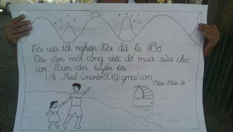 Theo lý giải, nam thanh niên này sinh năm 1990, vừa tốt nghiệp một trường đại học ở Hà Nội, đã lập gia đình và có con nên cuộc sống khó khăn. Tuy nhiên, công việc lại không thuận lợi khiến cử nhân phải cầm biển ra đường xin việc để "mua sữa cho con".