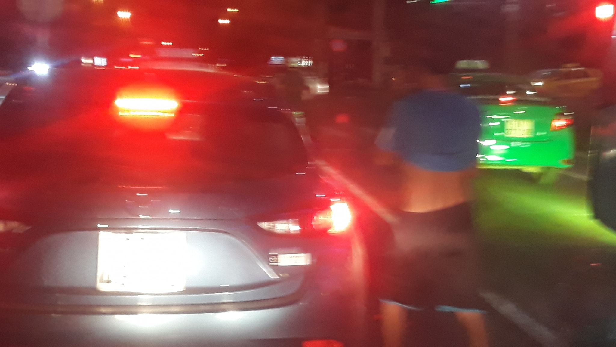Mặc dù tín hiệu đèn xanh đã 40 giây, cả dãy xe phía sau bấm còi inh ỏi nhưng nam thanh niên xem như không có chuyện gì xảy ra, vẫn thản nhiên tè bậy. Sau khi "giải quyết xong nỗi buồn", người này ung dung bước lên xe ô tô 37A-498.52 đi tiếp.