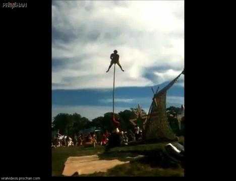 09/10/2012 08:01:00 +07:00(VTC News) - Người đàn ông có khả năng giữ thăng bằng cực tốt khi để bụng tì vào đầu gậy và xoay người trên độ cao cả chục mét.