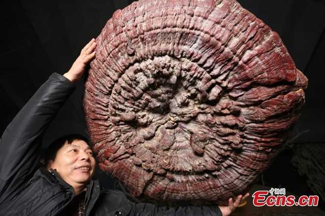 Một người đàn ông vác nấm Linh Chi (ganoderma lucidum) trong một bảo tàng ở thành phố Trịnh Châu, tỉnh Hà Nam, Trung Quốc. Bảo tàng này sở hữu hai nấm linh chi khổng lồ. Một cây có khối lượng 10 kg và đường kính 120 cm, còn cây kia có khối lượng 12 kg và đường kính 150 cm.