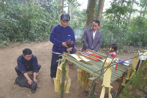Thầy mo bắt đầu đọc bài cúng bằng tiếng Mông “báo cáo” thần rừng chứng giám cho lòng thành của người dân Nàn Ma để che chở, phù hộ cho bà con sức khỏe, mùa màng tốt tươi, no đủ, mưa nắng ôn hòa. Sau khi thầy dứt lời, ba con vật được mang đi giết thịt ngay tại chỗ.
